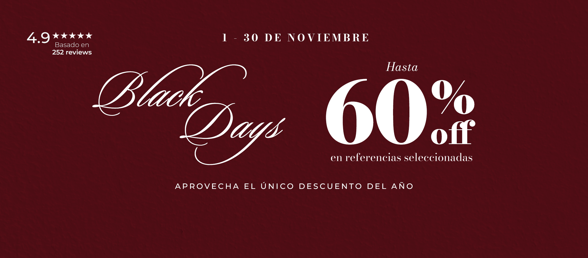 Los Black Days estarán activos del 1 al 30 Noviembre. Durante este periodo podrás disfrutar de descuentos exclusivos de hasta el 60% en productos seleccionados.